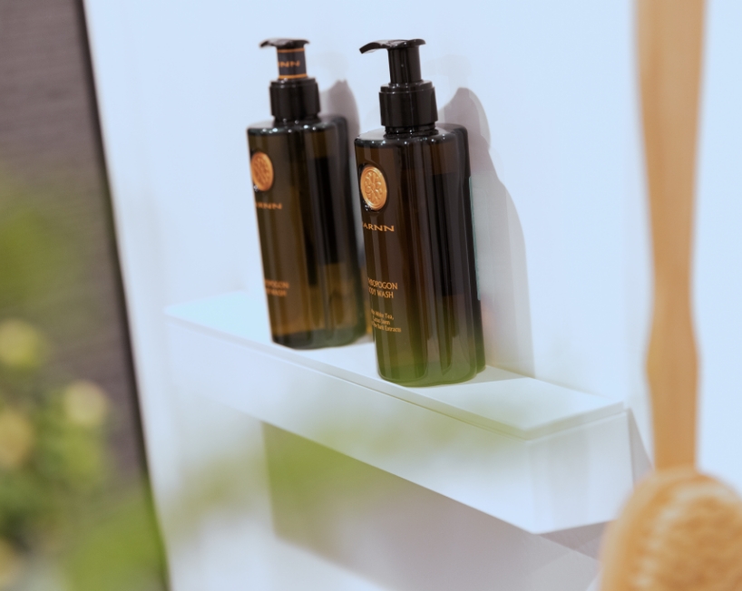 壁面には、シャンプーやボディソープなどのアイテムを収納できる収納棚を設置。マグネットと吸盤のダブルの力で密着。好きな場所に取り付けでき、便利です。