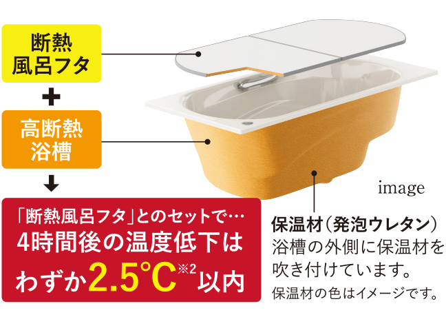 4時間後の湯温の低下を約2.5℃以内に抑制。断熱材と断熱風呂フタで浴槽をしっかりと包み、追いだきなしでもすぐ入浴でき、省エネ効果を高めます。