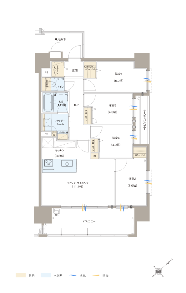 バルコニー面積 /13.20㎡(約3.99坪)サービスバルコニー面積 /3.63㎡(約1.09坪)